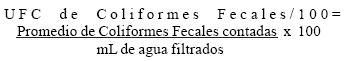 Los análisis se realizaron por el método de filtración en membrana de acuerdo a la norma NMXAA1021987. Se filtraron muestras de 100 mL de agua a través de membranas de 47 mm de diámetro, con tamaño de diámetro nominal de poro de 0.45 um (Milipore Mixed Cellulose Ester, Fisher Scientific). Después de la filtración la membrana se colocó en medio Agar m Endo Les (BD DifcoTM) e incubó de manera invertida a 45.5 °C por 24 h. Para el cálculo del número de unidades formadoras de colonias (UFC) de coliformes fecales se registraron únicamente las colonias con brillo metálico verdedorado, características del grupo de coliformes fecales, en los filtros que contenían de 20 a 80 colonias presuntivas. El cálculo se estimó con la fórmula siguiente: