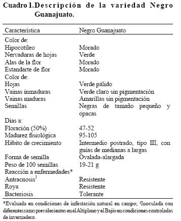 Negro Guanajuato is a new bean cultivar developed by the bean program of the Nacional Research Institute for Forestry, Agriculture and Livestock (INIFAP) at the Bajio Experimental Station, Celaya, Guanajuato. Negro Guanajuato is of indeterminate growth habit, type IIIa, disease resistant and a 100seeds weight that varies between 17 and 21 g. It has shown high yield potential under irrigated and rainfed conditions at the Bajio region of Guanajuato and can also be grown in the states of Puebla and Mexico. In Mattson type cookers, the seed of Negro Guanajuato has displayed cooking times from 50 to 65 min and protein content between 21 and 23.6%.