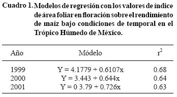 En el Cuadro 1, se presentan los modelos lineales generados que explican el rendimiento en función del índice de área foliar obtenida en la etapa de floración con los 18 tratamientos evaluados durante los tres años de estudio, observándose una alta similitud entre modelos ya que su pendiente se mantuvo con valores similares de 0.61 a 0.72 y su intercepto de 3.443 a 4.117, con valores de correlación 80% y coeficientes de determinación de 63–68%. Estos resultados permiten aceptar que el modelo puede ser utilizado como una herramienta confiable para estimar o predecir el rendimiento en parcelas comerciales en desarrollo, con un nivel de confiabilidad aceptable, como lo señalan Báez et al. (2002).