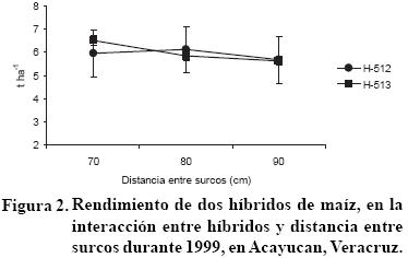Interacción híbridos, distancia entre surcos y distancia entre plantas. Esta interacción, sólo fue significativa durante 1999. Al analizar los datos se observó que los mayores rendimientos se obtuvieron con la combinación de los dos híbridos en cualquiera de las tres distancias de surcos, con las distancias de 20 y 40 cm entre plantas. Para la distancia entre plantas de 20 cm, la mejor combinación fue con H–512 y 70 u 80 cm entre surcos; mientras que para H–513, las mejores distancias fueron de 70 y 90 cm. En relación con las distancias de plantas de 40 y 60 cm, para H–512 se pueden utilizar cualquiera de las tres distancias de surcos, en tanto que para H–513 la mejor distancia fue la de 70 cm (Figura 5).