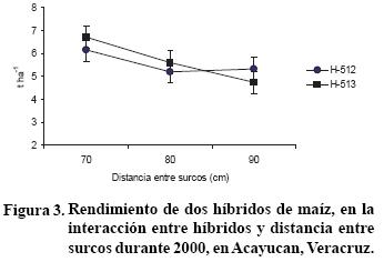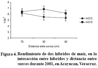 Interacción híbrido y distancia entre plantas (2000). El análisis de varianza también mostró un efecto significativo de esta interacción y de acuerdo con la comparación de medias la combinación superior se obtuvo con el híbrido H–512 y una distancia de plantas de 20 cm, mientras que para H–513 no se tuvieron diferencias estadísticas (Figura 6).
