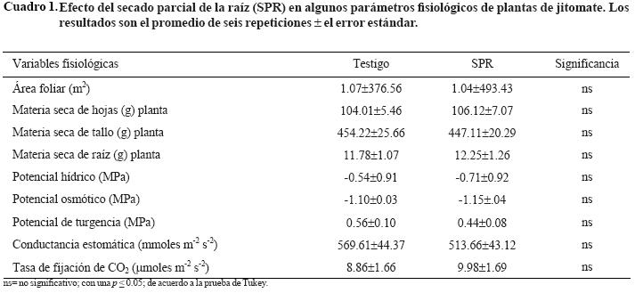 El área foliar en jitomate se midió durante y al final del experimento (Cuadro 1) y se encontró que el tratamiento de SPR provocó una reducción no significativa (3%) del área foliar. Otros autores (Davies et al., 2000), reportaron resultados similares a los que se encontraron en este análisis. La materia seca de la hoja, tallo y raíz, muestran que no hubo diferencias estadísticas significativas entre los tratamientos. Dorji et al. (2005), reportaron resultados semejantes en relación con la materia seca de los diferentes órganos, en plantas de chile en un experimento de SPR.