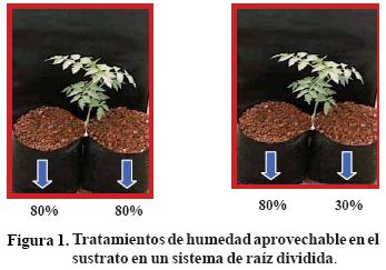 El trasplante se hizo 40 días después de la siembra y cuando las plántulas presentaron la quinta hoja verdadera, en ese momento la raíz de las plántulas, se dividió longitudinalmente con una navaja en dos partes iguales, un poco arriba del cuello de la raíz hasta el ápice. Posteriormente, las plántulas se trasplantaron en dos bolsas de polietileno de 40 x 40 cm, una para cada sección de la raíz, unidas en el centro con cinta adhesiva. Se establecieron 5 plantas m2, cada contenedor tuvo 14 L de roca volcánica porosa (tezontle) con granulometría mayor de 2.0 mm y menor de 11.5 mm, ρa= 0.63 g cm3una retención de humedad de 1.9 L. Las plantas durante el crecimiento se manejaron a 10 racimos y a un sólo tallo, en donde se practicó la eliminación de yemas axilares cada siete días, podas de hojas en estado de senescencia y se sostuvo verticalmente con hilo rafia. Se establecieron dos tratamientos con humedad aprovechable en el sustrato distinta, testigo (80 80%) y SPR (80 30%). El 100% de humedad aprovechable correspondió a capacidad de campo equivalente a una retención de humedad de 1.9 L por bolsa.
