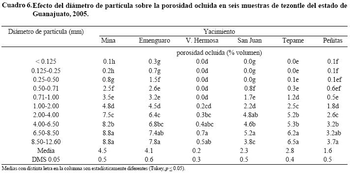 La porosidad ocluida (Po) se incrementó con el aumento del tamaño de partícula. Cabe destacar que las muestras Mina y Emenguaro fueron las que presentaron el mayor valor medio de 4.5 y 4.1%, respectivamente; por lo tanto, estos dos materiales son altamente porosos, mientras que las muestras Tepame, San Juan y Peñitas tuvieron valores intermedios (2.8, 2.3 y 1.6%, respectivamente) y V. Hermosa los menores en todas sus fracciones, por lo que este material es poco poroso, sobre lo que Baca et al. (1990) indicaron que es preferible el tezontle más poroso porque facilita el manejo y favorece al cultivo (Cuadro 6).