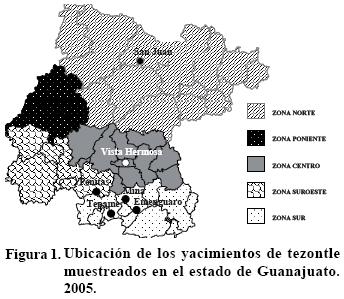 El estudio se realizó en junio de 2005 en el laboratorio de sustratos de la unidad de horticultura protegida del INIFAP, ubicado en el Campo Experimental Bajío, en Celaya, Guanajuato. Se evaluaron seis muestras de tezontle colectadas en diferentes yacimientos: en la zona norte, San Juan (tezontle rojo); en la zona centro, Vista Hermosa (tezontle rojo); en la zona sur Mina (tezontle negro); Emenguaro (tezontle rojo) y Tepame (tezontle negro), y en la zona suroeste Peñitas (tezontle rojo) (Figura 1).