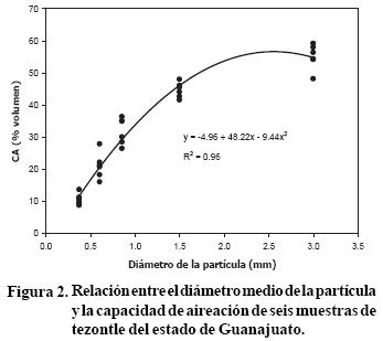 Las fracciones 0.25 a 1.00 mm muestran un papel esencial en la relación aguaaire y por ende en la formulación de sustratos de tezontle existe una relación inversa muy estrecha entre el contenido relativo de agua y la capacidad de aireación, cuya función se puede utilizar para determinar las mejores propiedades de aireación y capacidad de retención de agua.