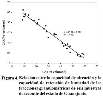 La relación entre CRH y CA fue lineal con R2 de 0.96. Se observó que una CRH de 50% está asociada con una CA de 19%, una CRH de 40% está asociada a una CA de 30% (Figura 4). Se considera que esta sería la relación ideal para el sustrato de tezontle; es decir, es recomendable que la de fracción granulométrica presente una CRH del orden de 40%, para contar una buena reserva de agua y al mismo tiempo adecuada aireación en el sustrato.