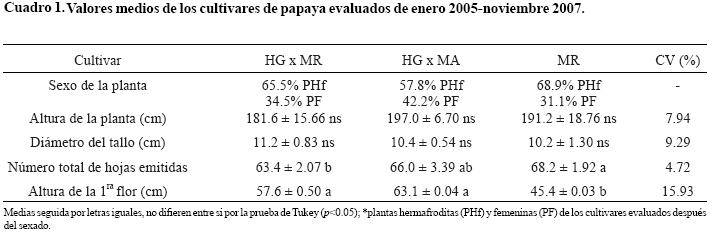De la observación del Cuadro 1, se deduce que no hubo diferencias significativas para el carácter diámetro del tallo en los híbridos evaluados e incluso con el cultivar Maradol Roja.