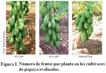 En la Figura 1 se muestra el número de frutos por planta para cada uno de los híbridos de papaya. Las plantas de ambos híbridos producen similar número de frutos por planta, diferenciándose significativamente con el cultivar Maradol Roja (Cuadro 3).