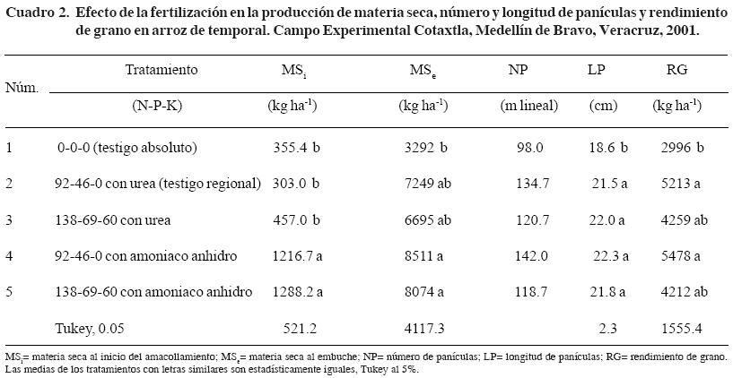 La más alta producción de materia seca al inicio del amacollamiento y en la etapa de embuche se observó en los tratamientos fertilizados con amoniaco anhidro en presiembra; lo anterior, confirma el efecto residual de este fertilizante en el suelo (Cortés et al., 2005). Aunque no se observó efecto significativo en el número de panículas por metro lineal, la más alta producción se observó con el tratamiento 92460 con amoniaco anhidro, seguido de esta misma fórmula, pero con urea (Cuadro 2). En arroz, el número de panículas producidas es uno de los principales componentes del rendimiento (Orona et al., 1995), por lo que es explicable que en estos dos tratamientos se observaran los más altos rendimientos de arroz palay. En el mismo cuadro, se muestra que la longitud de panícula fue estadísticamente igual en las cuatro dosis de fertilización y en promedio fueron 3.3 cm más largas que las plantas no fertilizadas.