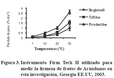 A cada tratamiento se le tomo una lectura inicial de firmeza y peso del fruto que sirvieron de base para estimar los porcentajes de pérdida de estos dos parámetros en el transcurso del experimento. La temperatura de referencia fue la de refrigeración a 1 °C que es la utilizada por las empresas comerciales para conservar los frutos de arándano. Así por ejemplo, las muestras del tratamiento de prealmacenamiento o prerefrigeración de 12 h se colocaron por ese tiempo bajo las cuatro temperaturas descritas, y luego fueron puestas en refrigeración a 1 °C.