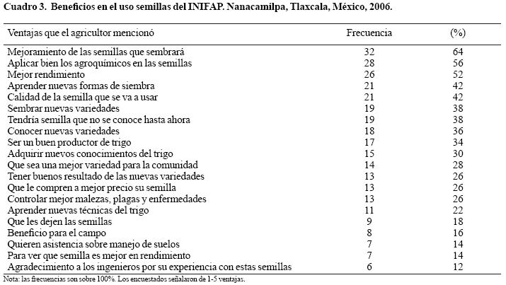 Los productores encuestados fueron consultados con respecto a los beneficios que tendrían al usar semillas de las variedades mejoradas del INIFAP, los datos se indican en el Cuadro 3. Los resultados indican que 64% de los agricultores(as) hacen referencia al mejoramiento de las semillas que sembrará, 56% refieren aplicar bien los agroquímicos en las semillas, 52% mejor rendimiento, 42% aprender nuevas formas de siembra, entre las principales.