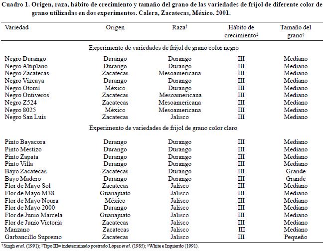 En un experimento se evaluaron nueve variedades de frijol de grano color negro y en otro, 14 variedades de grano color claro. Estas variedades son de diferente raza y origen (Cuadro 1) y todas son de hábito de crecimiento indeterminado postrado Tipo III (López et al., 1985). La mayoría de estas variedades han sido identificadas como resistentes a la sequía, con base en el rendimiento obtenido por cada variedad en diferentes localidades sujetas a sequía temporal (AcostaGallegos et al., 1998). Con excepción de Negro San Luís que es un criollo regional, el resto son variedades mejoradas desarrolladas por el programa nacional de mejoramiento genético del Instituto Nacional de Investigaciones Forestales, Agrícolas y Pecuarias (INIFAP) (RosalesSerna et al., 2004).
