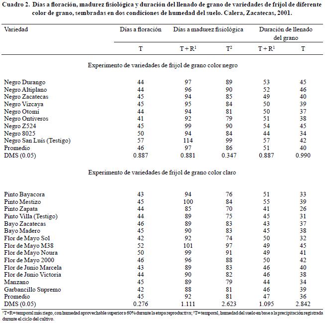 En el experimento de variedades de grano negro, el testigo Negro San Luís de la raza Jalisco fue la más tardía a la floración y madurez fisiológica, mientras que Negro Ontiveros de la raza Mesoamericana, fue la más precoz. En el experimento de variedades de grano color claro, Flor de Mayo M38 y Flor de Mayo Noura, de la raza Jalisco fueron las más tardías; mientras que Pinto Bayacora, Pinto Zapata, Pinto Villa, Bayo Zacatecas, Bayo Madero, Flor de Mayo Sol, Flor de Mayo 2000, Flor de Junio Marcela, Flor de Junio Victoria, Manzano y Garbancillo Supremo, las primeras cinco pertenecientes a la raza Durango y las últimas seis, pertenecientes a la raza Jalisco, fueron las más precoces (Cuadro 2).