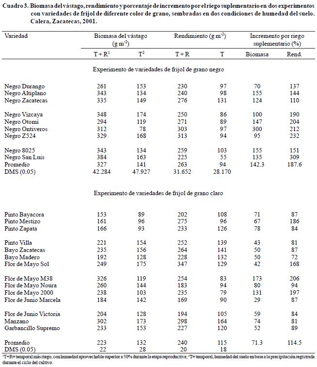 Se observaron diferencias altamente significativas (p<0.001) entre condiciones de humedad del suelo, variedades e interacción condición de humedad x variedad para la biomasa del vástago y rendimiento de grano en ambos experimentos (variedades de grano negro y variedades de grano claro). En promedio de las variedades, el incremento por el riego suplementario fue mayor para el rendimiento de grano que para la acumulación de biomasa en el vástago en los dos experimentos (Cuadro 3). Esta respuesta se debió a que las condiciones de humedad en el tratamiento de temporal se tornaron más severas hacia el final del ciclo de cultivo, cuando la biomasa del vástago ya se había definido, mientras que el grano aún estaba en formación, afectando adversamente su tamaño. Resultados similares han sido consignados por otros autores (AcostaGallegos y KohashiShibata, 1989; AcostaGallegos y Adams, 1991; Ramírez y Kelly, 1998).