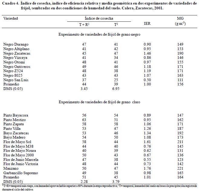Se observó diferencia altamente significativa (p<0.001) entre tratamientos de humedad del suelo y variedades para el índice de cosecha (datos no presentados). La mayoría de las variedades presentaron una disminución para el índice de cosecha en la condición de temporal con respecto la tratamiento de temporal más riego suplementario (Cuadro 4). Resultados similares fueron consignados por Foster et al. (1995) y Padilla et al. (2004) para otras variedades. En la presente investigación, el efecto de riego suplementario promedio de las variedades fue muy similar en los dos experimentos. Entre las variedades que exhibieron el mayor efecto positivo están: de grano negro, Negro San Luís y Negro Z524, y de grano claro, Pinto Bayacora, Garbancillo Supremo, Pinto Mestizo, Bayo Zacatecas y Flor de Junio Marcela.