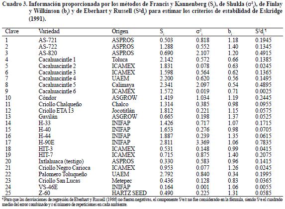 En los cuatro métodos de Eskridge (1991), los genotipos estables o deseables fueron los que presentaron los mayores índices. Así, el método 1 [el que usa la varianza de un cultivar a través de los ambientes (Francis y Kannenberg, 1978) detectó 17 variedades estables; los seis Cacahuacintles, Palomero Toluqueño y H90E fueron inestables. El método 2 [el que usa la varianza de estabilidad de Shukla (1972)], clasificó 18 variedades estables; AS820, Cacahuacintles 1, 3, 4 y 5 y Palomero Toluqueño fueron inestables. El método 3 [el que utiliza el coeficiente de regresión de Finlay y Wilkinson (1963)] detectó 22 variedades estables, con excepción de los Cacahuacintles 4 y 5 y Palomero Toluqueño. El método 4 [el que se calcula con las desviaciones de regresión de Eberhart y Russell (1966)] identificó 21 variedades estables; los Cacahuacintles 1, 4 y 5, y Palomero Toluqueño fueron inestables (Cuadro 4).