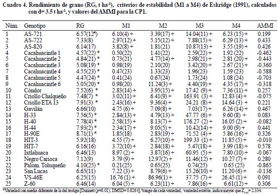 Al rendimiento de grano también se aplicaron las metodologías multivariadas del AMMI (Zobel et al., 1988; Vargas y Crossa, 2000) y de genotipo x método de Eskridge (Sánchez, 1995; González et al., 2007). Los índices (Cuadros 1 y 2) de Finlay y Wilkinson (1963), de Eberhart y Russell (1966), de Shukla (1972) y de Francis y Kannenberg (1978), fueron empleados para calcular los cuatro criterios de estabilidad (Cuadro 4) de Eskridge (1991). Para la identificación de variedades sobresalientes se consideraron valores mayores que 3.5 t ha1, empleando un nivel de significancia de 1% y con Z1α como el percentil 1a de la distribución normal estándar (Cuadro 1). Una variedad es estable si su índice es mayor que Z1α.