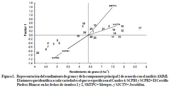 En el método AMMI (Figura 1; Cuadro 4) se detectaron cuatro grupos de genotipos: en el grupo 1 se identificó a Palomero Toluqueño (22), la variedad de menor rendimiento; en el grupo 2 se clasificó a los seis Cacahuacintles (genotipos 4 a 9, entre 4.47 y 5.08 t ha1); en el grupo 3 se agruparon Ixtlahuaca (20), San Lucas (23), Negro (21), HIT3 (18), HIT7 (19), AS721 (1), AS722(2), AS820 (3), Gavilán (13), VS46E (24) y Z60 (25); el grupo 4 se formó con Chalqueño (11), ETA 13 (12), Cóndor (10), H33 (14), H40 (15), H44 (16) y H90E (17).