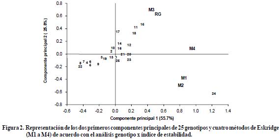 Estos resultados coinciden parcialmente con los publicados por Eskridge (1991). De acuerdo con Lin et al. (1986) el método 1, el que se calcula con la varianza de un cultivar a través de los ambientes, pertenece al grupo 1, mientras que los métodos 3 y 2, que miden que tanto la respuesta de un cultivar a los ambientes es paralela a la respuesta promedio de todos los genotipos del ensayo, pertenecen al grupo 2; el método 4 incluye información de los grupos 2 y 3, por lo que debe estar más relacionado con ambos métodos.