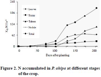 The dynamics of nitrogen fixation of the species P. ahipa and P. erosus was similar up to 170 DAP, from that date onwards the amount fixed was greater in P. erosus due to a longer growing cycle.