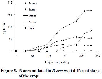 Castellanos et al. (1997) conducted a field test in the central region of Mexico to assess the nitrogen fixation of two P. ahipa accessions (58 to 80 kg N ha1) and three P. erosus bred cultivars (162 to 215 kg N ha1). The amount of nitrogen recorded in the residues of P. erosus was from 120 to 150 kg ha1 twice the amount recorded in P. ahipa residue and is higher than the quantity recorded in practically all grain legumes (Sorensen, 1996). Following that line of research, an experiment was conducted to determine if there is an association between the dynamics of N2 fixation and biomass accumulation and tuber yield in P. erosus bred cultivar San Juan EC550 and P. ahipa accession 102, introduced from Bolivia.