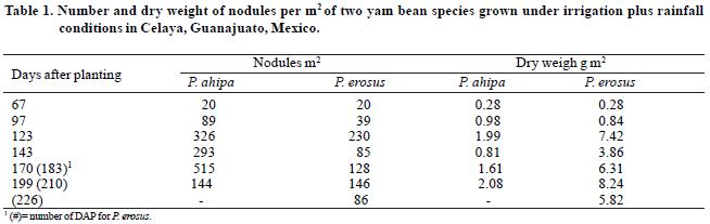 In both species fixing nodules were present since the first sampling date (67 DAP) and its number and mass increased in subsequent samplings (Table 1). During the growing cycle, P. erosus reached the highest number of nodules at 170 DAP and its number was similar to the observed in previous reports (Tamez, 1987; Castellanos et al., 1997), while in P. ahipa it was observed at 123 DAP. P. ahipa had a higher number of nodules than P. erosus, but of smaller size, therefore, the dry weight of nodule mass was significantly higher (p>0.01) in P. erosus from 123 DAP onwards.