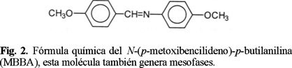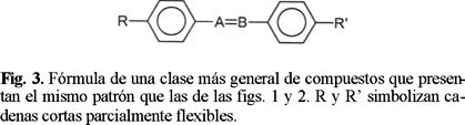 Desde el punto de vista de su composición química, algu nos ejemplos de cristales líquidos termotrópicos son: algunos compuestos orgánicos cuyo rasgo molecular general es cierta elongación, un ejemplo clásico es p-azoxianisol (PAA) ver figura 1. Otro ejemplo de interés práctico es N (I)-metoxibencilideno)-p butilanilina (MBBA) [6] ver figura 2. La estruc tura mostrada en la figura 3 corresponde a una clase más am plia de moléculas orgánicas con el mismo patrón general. Asi como también la familia de los ésteres de colesterol [7] cuya fórmula se ilustra en la figura 4.