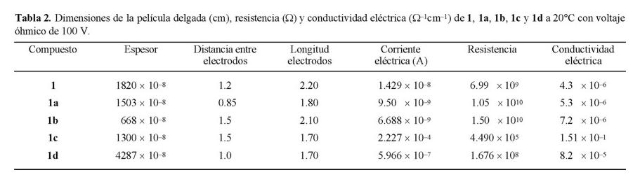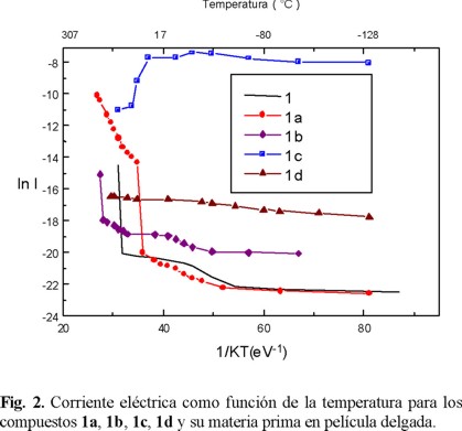 En la Fig. 2 se observa que excepto el compuesto 1c, los compuestos en película delgada presentan el comportamiento correspondiente al de un material semiconductor. Se observa, por otro lado, que el compuesto 1c es el que presenta menor resistencia, lo que se asocia con un material altamente conductor, como lo demuestra el comportamiento de la corriente eléctrica casi constante a bajas temperaturas; por arriba de 15ºC el comportamiento observado se asocia con el de un conductor. Este efecto no se relaciona con cambios químicos en la estructura del compuesto (aun cuando estos materiales sean higroscópicos). A diferencia de las mediciones en pastilla, los compuestos presentan un comportamiento mas regular en película delgada. En estos materiales, la menor resistencia la presentan los compuestos con substituyentes voluminosos y de alto peso molecular como en 1c y 1d (con L = 1,12-diamino-dodecano y 2,6-diaminoantraquinona, respectivamente).