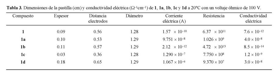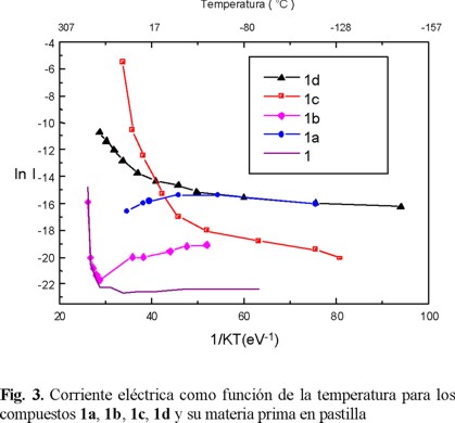 En la Fig. 3 se observa que los compuestos 1c y 1d presentan el comportamiento típico de un semiconductor a cualquier valor de temperatura. Por otro lado, el compuesto 1a presenta un comportamiento de semiconductor hasta valores cercanos a −40ºC y a temperaturas mayores, su comportamiento cambia drásticamente al de un conductor. Esto contrasta con lo observado en la materia prima; que a temperaturas superiores a −40ºC se comporta como semiconductor. Finalmente el compuesto 1b presenta una resistencia eléctrica constante a bajas temperaturas y a partir de aproximadamente 150ºC se comporta como semiconductor. En esta serie de compuestos, no se presenta un comportamiento similar entre ellos, esto se debe a que los compuestos pueden considerarse como higroscópicos y aunque las mediciones eléctricas se llevaron a cabo al vacío, es probable que durante la preparación y el manejo de la pastilla se hayan alterado dichos compuestos.