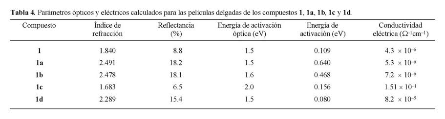 De los resultados de conductividad eléctrica obtenidos para los compuestos en película delgada que se muestran en la Tabla 2, se observa que todos los compuestos presentan conductividades eléctricas con magnitudes dentro del intervalo reportado en la literatura [2, 9] para los semiconductores moleculares (10-6 a 101 Ω-1cm−1).