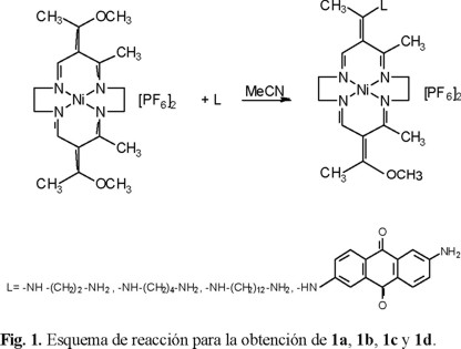 [Ni(C17H25N4O(C14H10N2O2))](PF6)2*8H2O, 1d: Método semejante al empleado para 1c con una muestra de 1.0 g (2.6 mmol) de 1, disuelta en 40 mL de acetonitrilo. Se adicionan 0.6 mL (4.3 mmol) de trietilamina y posteriormente 1.24 g de 2,6-diaminoantraquinona (en exceso), previamente disuelta en 40 mL de acetonitrilo. Rendimiento de la reacción 1.62 g (77.8%). P.f. = 318°C. Análisis elemental calculado: 50.20%C, 6.75%H y 11.34%N. Análisis obtenido: 50.15%C, 6.28%H y 11.23 %N. IR (pastillas KBr) cm−1: 2942, 2960 ν(NH2); 3405 ν(N-H); 1577 ν(C=N); 1631 ν(C=C).