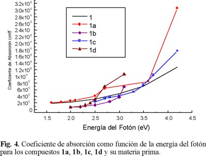 De los espectros de transmisión óptica de los compuestos en película delgada, se obtuvieron los valores de coeficiente de absorción (α) como función de la energía del fotón (Efotón). Como se muestra en la Fig. 4, se puede observar un comportamiento similar en todos los compuestos. Dado que los materiales son de naturaleza amorfa, las propiedades ópticas de los mismos se analizan mediante el modelo de Tauc [13, 15].