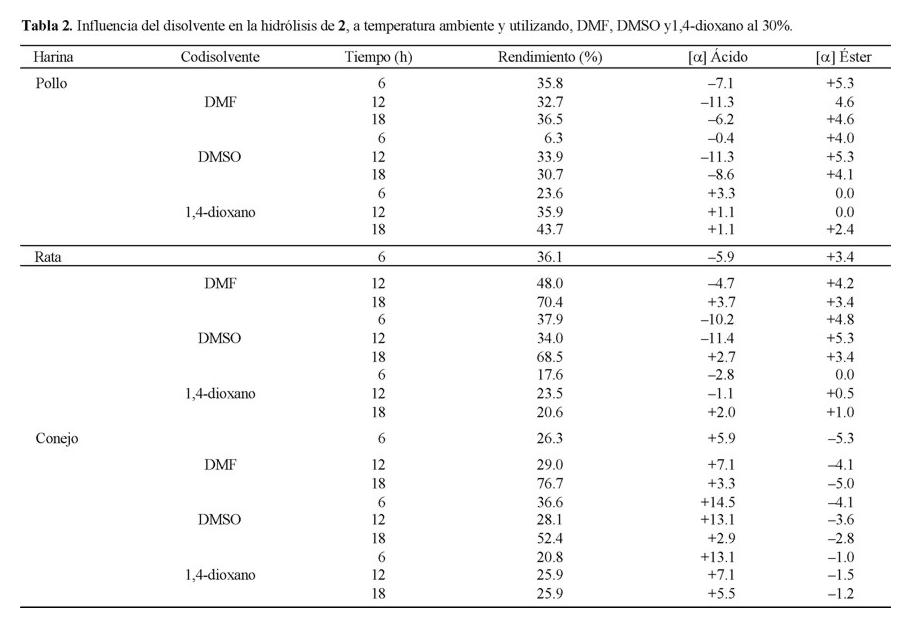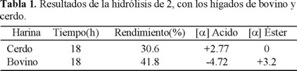 En un ensayo preliminar se consideró la hidrólisis catalizada por las enzimas presentes en los hígados de bovino y cerdo, empleando como co-disolvente al éter etílico, en buffer de fosfatos (pH 7.5), pues se sabe que los procesos que involucran a estas hidrolasas dan productos con altos excesos enantioméricos [4,9], obteniéndose para estas reacciones rendimientos de 41.8 y 30.6%, respectivamente, a temperatura ambiente (Tabla 1).