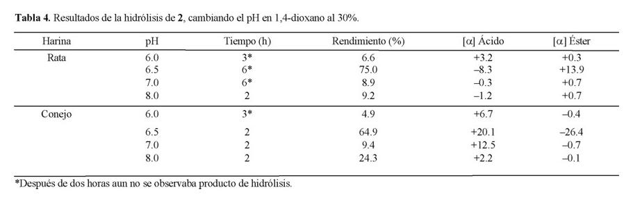 Posteriormente se efectuó un estudio del efecto del pH utilizando solamente los hígados de rata y conejo con el co-disolvente en el cual se obtuvo la mejor estereoselectividad; los resultados se encuentran resumidos en las Tablas 3 y 4, de donde es claro que el hígado de conejo a pH de 6.5 y a tiempo de reacción de 2 h en 1,4-dioxano muestra valores de rotación óptica altos tanto para el ácido como para el éster que no reacciona.