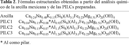 Estos resultados son equiparables a los que reportan Tokarz y Shabtai [13] quienes encontraron que la cantidad mínima necesaria para una pilarización exitosa de montmorillonitas con Al13 fue de 2 mmol Al/g de arcilla.