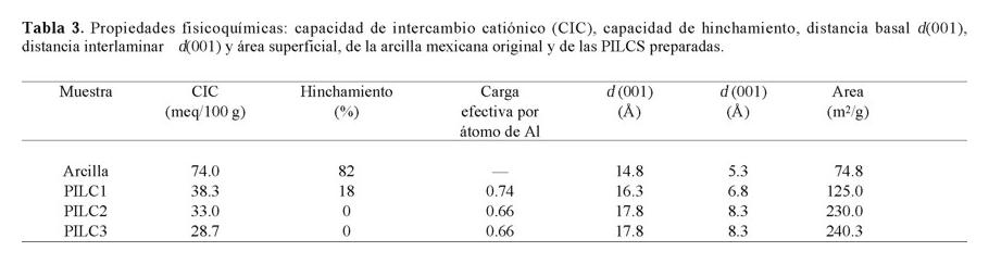 Las evidencias de la pilarización se observan en la Tabla 3. Las PILCS presentaron menor CIC que la arcilla natural, debido al desplazamiento de los cationes originales por la introducción de los policationes de Al; una capacidad de hinchamiento baja o nula, dado que los pilares de aluminio mantienen unidas las láminas de silicato, formando una estructura rígida; una expansión del espacio interlaminar (Δd) que se reflejó en el incremento de los valores de la reflexión de primer orden d (001) con respecto a la arcilla original (Fig. 3) y un aumento del área superficial debido a la exposición de las regiones internas de la arcilla y de las superficies de los pilares de Al intercalados [5, 7, 13].