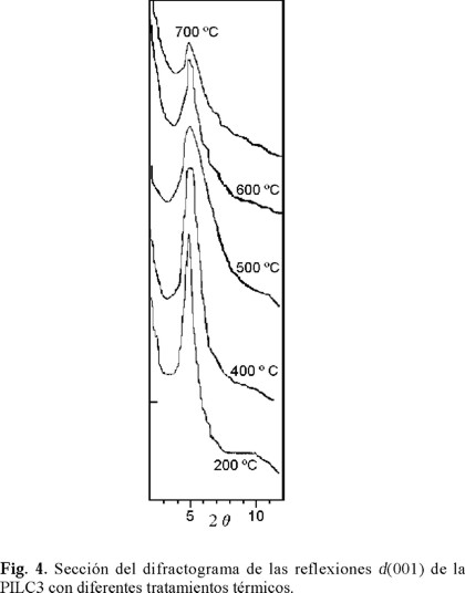 En la Fig. 4 se observan los picos de las señales d(001) de la PILC3 sometida a diferentes temperaturas y en la Tabla 4 se reportan los valores de las distancias interlaminares correspondientes. La PILC3 sometida a 400 °C, presentó la misma distancia interlaminar que la PILC3 sometida a 200 °C, en tanto que la intensidad de la señal disminuyó ligeramente. A partir de los 500 °C, la distancia interlaminar disminuyó hasta un valor de 7.9 Å, que permaneció constante hasta los 700 °C. Sin embargo, la intensidad y agudeza del pico disminuyeron paulatinamente al incrementarse la temperatura (Fig. 4).