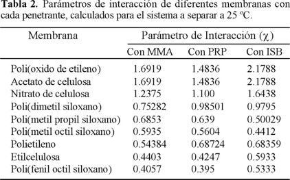 Para el cálculo del término entálpico χh de la ecuación (18), se utilizaron los valores de δ reportados en la Tabla 1, mientras que el valor del termino entrópico se consideró constante e igual a 0.35, valor aceptado para este tipo de sistemas de pervaporación. Los resultados se muestran en la Tabla 2, donde se marcan con negritas aquellos polímeros que muestran una gran interacción con las impurezas (ISB y PRP) y una interacción menor con el MMA, de tal manera que las impurezas pueden hinchar al polímero mas rápidamente que el MMA y por lo tanto dichas impurezas pueden atravesar la membrana más fácilmente que el MMA. Como se aprecia en la Tabla 2, el PMPS y el PMOS muestran diferencias en los valores de χ, que favorecen la separación de las impurezas.