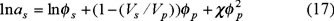 Donde los subíndices s y p se refieren al disolvente y al polímero respectivamente, V es el volumen molar, φ es la fracción en volumen en el sistema disolvente-polímero, as es la actividad del disolvente en la membrana y χ es el parámetro de interacción disolvente-polímero. El valor de χ se puede obtener mediante la siguiente ecuación: