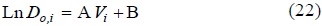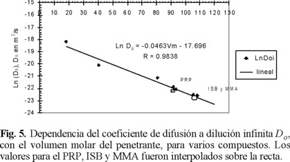 Sabemos que un parámetro muy importante para cuantificar la difusión de un penetrante a través de una membrana es el coeficiente de difusión a dilución infinita Do,i. Se ha reportado en investigaciones hechas por Favre (1994), una relación de tipo lineal entre el ln Do,i y el volumen molar del penetrante Vi, para diversos sistemas polímero / penetrante de acuerdo con la expresión (22):