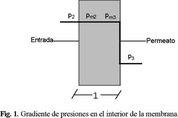 Con la consideración de que la presión de la disolución de entrada, p2, prevalece a través de la membrana, y dicha presión decrece hasta la frontera entre la membrana y el permeato, entonces las ecuaciones (8 y 9) se pueden escribir de la siguiente forma: