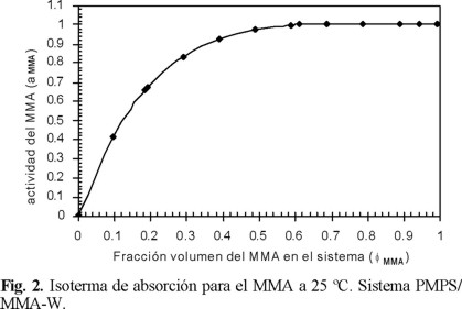 En las isotermas de absorción para el sistema PMPS/ MMA el valor de actividad igual a uno se alcanza para una concentración de φMMA = 0.612, mientras que para el sistema PMPS/W se alcanza el valor de aW = 1 para una concentración de φW = 0.797.