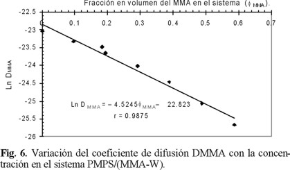 Se prepararon las gráficas de Ln Di vs. φi, para los sistemas PMPS/MMA y PMPS/W con el fin de conocer los valores de γ'. Las figuras 6 y 7 describen en forma adecuada el comportamiento del coeficiente de difusión en función de la concentración.