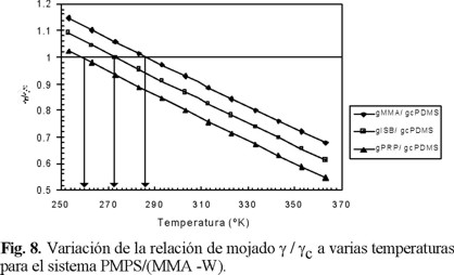 La relación de mojado γ/γc para el PMPS en presencia de MMA, ISB y PRP.