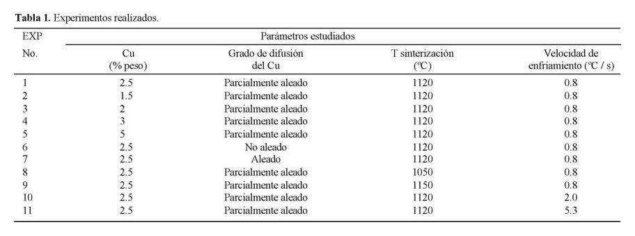 Todas las mezclas se prepararon mediante técnica convencional en mezclador de laboratorio tipo "V", durante 20 minutos a 50 r.p.m. Las diferentes mezclas fueron prensadas en forma de probetas cilíndricas de 25.4 mm de diámetro y 12.5 mm de altura, hasta densidad de 6.8 g / cm 3. Posteriormente fueron sinterizadas en un horno de cinta a temperaturas entre 1050 °C y 1150 °C, en atmósfera de N2 / 5H2 / CH4, con control de potencial de carbono. En la Tabla 1 se muestran las diferentes mezclas preparadas, así como las variables del proceso estudiadas.