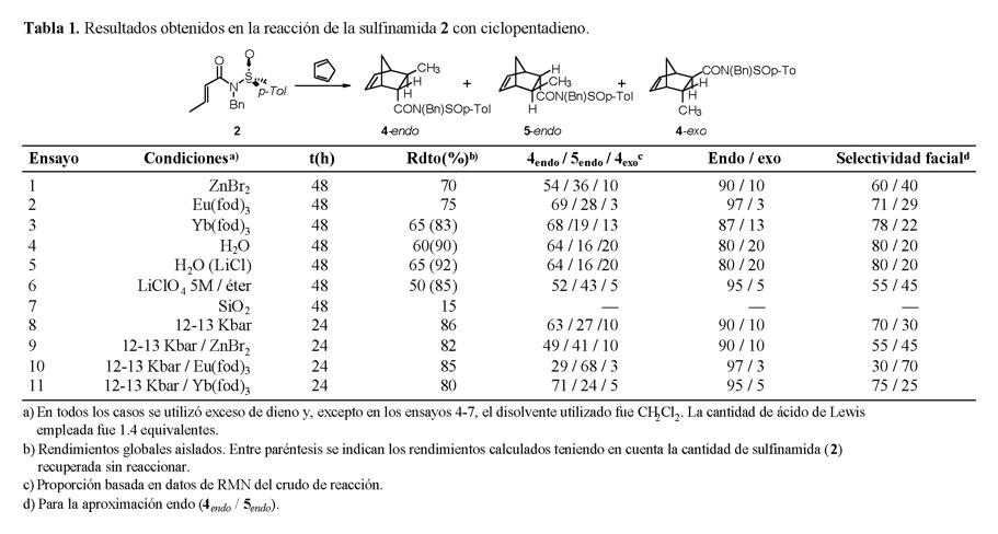 Un resumen de los resultados más significativos de las reacciones de 2 con ciclopentadieno bajo diferentes condiciones aparece recopilado en la Tabla 1. Un primer intento, realizado a temperatura ambiente en ausencia de catalizadores, puso de manifiesto la baja reactividad esperada del dienófilo, que se recuperó inalterado tras mantenerle 20 días en contacto con ciclopentadieno en exceso. El uso de fuertes ácidos de Lewis (SnCl4, Me2AlCl, BF3.Et2O, Sc(OTf)3 y TiCl4) como catalizadores no permitió solucionar el problema, provocando la desulfinilación del dienófilo con formación de N-bencil-2-butenamida.