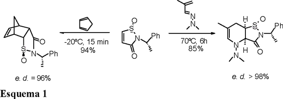 La gran eficacia de la reacción de Diels-Alder en la construcción de enlaces C-C y la posibilidad de formar hasta 4 centros quirales en una sola etapa hacen de esta reacción uno de los métodos más utilizados en síntesis orgánica [1]. En su versión asimétrica, se han descrito reacciones en las que la información quiral es aportada por el dieno o, en mayor medida, por el dienófilo. Entre estos últimos, los sustratos más estudiados son los acrilatos derivados de alcoholes quirales [1e]. El uso de acrilamidas como dienófilos quirales [2] ha sido mucho menos estudiado debido, probablemente, a su inferior reactividad [3]. La incorporación de otro grupo atractor en el nitrógeno amídico mejora la reactividad, consiguiéndose excelentes selectividades en algunos casos como el de las oxazolidinonas descritas por Evans [4] y desarrolladas posteriormente por otros autores [5], y el de las sultamas descritas por Oppolzer [6]. La utilización del grupo sulfinilo como activante del grupo amido en este tipo de reacciones no ha sido nunca estudiada. El único precedente referible es la sulfinamida cíclica 1 [7], que es capaz de reaccionar con ciclopentadieno y 1-azabutadienos con buenos rendimientos y elevados excesos diastereoisoméricos (Esquema 1). No obstante, estos resultados no pueden ser extrapolados al comportamiento de las N-sulfinil acrilamidas, ya que en el compuesto 1 el grupo sulfinilo ejerce un efecto activante doble (por estar unido simultáneamente al doble enlace dienofílico y al nitrógeno amídico) y se encuentra directamente unido al centro proquiral reactivo, lo que sugiere una superior reactividad y un control más eficaz de la estereoselectividad.