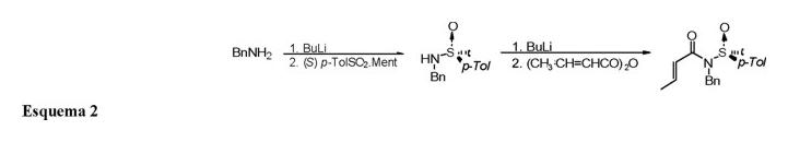 En relación con la búsqueda de nuevos agentes de sulfinilación, más reactivos que el p-toluenosulfinato de mentilo, describimos hace unos años la síntesis de diversas N-sulfinamidas N-alquilsustituidas [8], entre las que se encuentra una N-sulfinil acrilamida, la (S)-(E)-N-bencil-N-p-tolilsulfinil-2-butenamida (2) (Esquema 2). Su reactividad dienofílica debe ser superior a la de las acrilamidas, por encontrarse el nitrógeno unido al sulfinilo, mientras la existencia de varios centros básicos en la molécula sugería la posibilidad de controlar la estereoselectividad mediante el uso de ácidos de Lewis adecuados. Por estas razones decidimos estudiar su comportamiento frente a ciclopentadieno con el fin de explorar las posibilidades de las N-sulfinil amidas como inductores quirales en reacciones de Diels-Alder asimétricas. Aunque su reactividad sea previsiblemente inferior a la de 1, las conclusiones deducidas de su estudio podrían ser de aplicabilidad mucho más general, dado que la preparación de cualquier compuesto de estructura semejante se puede conseguir con relativa facilidad por sulfinilación de la correspondiente amina y posterior acilación [8] (Esquema 2).