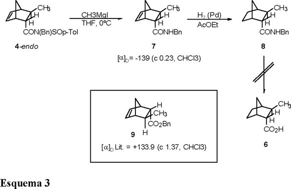 Con el fin de asignar la configuración del aducto mayoritario 4-endo, se intentó su correlación química con el ácido 6 (del que existen descritos valores del poder rotatorio para ambos enantiómeros [13]) a través de la secuencia mostrada en el Esquema 3. La reacción de 4-endo con CH3MgI en THF a 0 °C produce la eliminación del grupo sulfinilo con formación del compuesto 7, cuya reducción con H2(Pd) en acetato de etilo da lugar a la amida bencílica 8. Desgraciadamente, todos los intentos de hidrólisis ácida o básica de 8 para obtener el ácido carboxílico 6 resultaron infructuosos.
